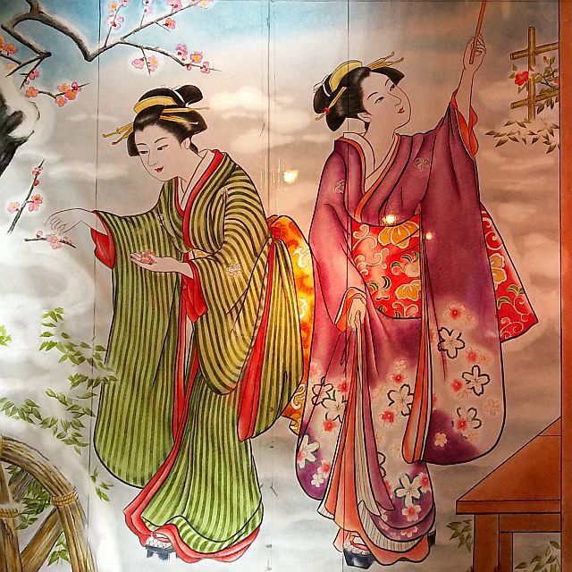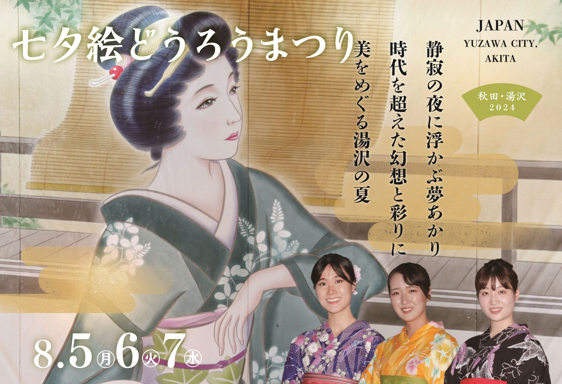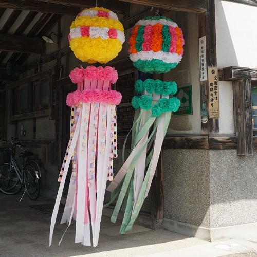 期間中、家々では青竹に五色の短冊や吹流し等をつり下げて門前に飾るほか、浮世絵美人が描かれた大・小百数十基の絵どうろうが通りに下げられます。